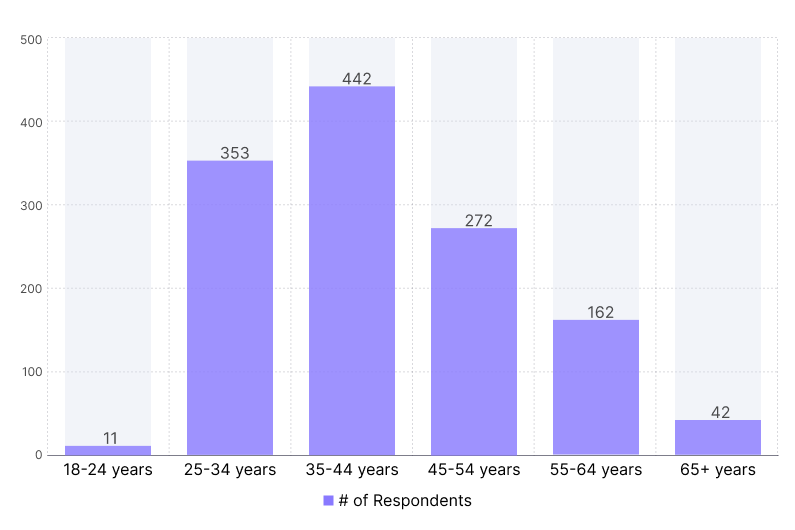 Age distribution skewed mid-career, with the majority between 25–44 years old (61.8%), followed by 45–54 (21.2%) and smaller groups in younger and older brackets.