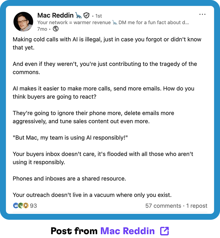 Automation has made it easy to send thousands of emails, sequence dozens of touches, and spin up new reps quickly. AI has lowered the barrier even further, enabling teams to scale messaging faster than ever before. At the same time, more companies are selling into the same finite pool of buyers.