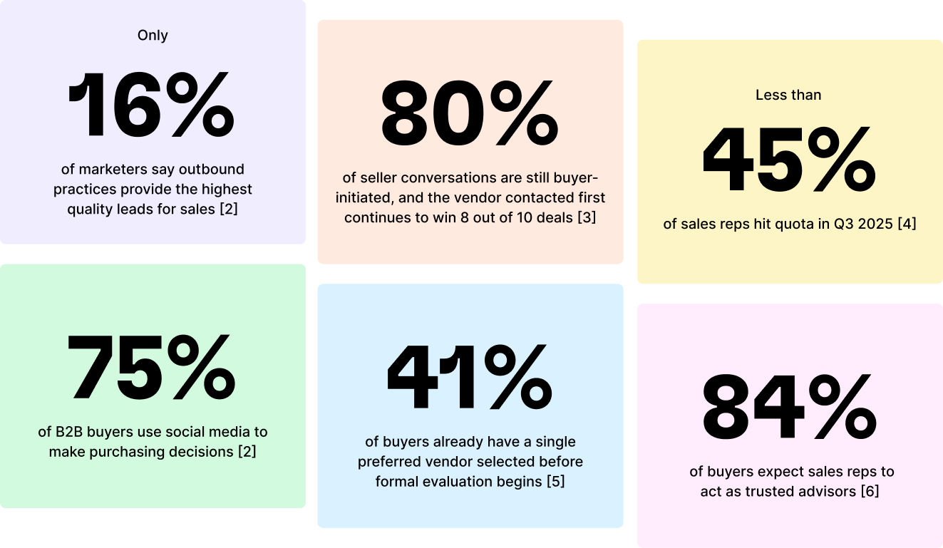 But they’re missing quota because the motions they rely on most, cold calls, cold emails, and outbound sequences, are no longer sufficient on their own.